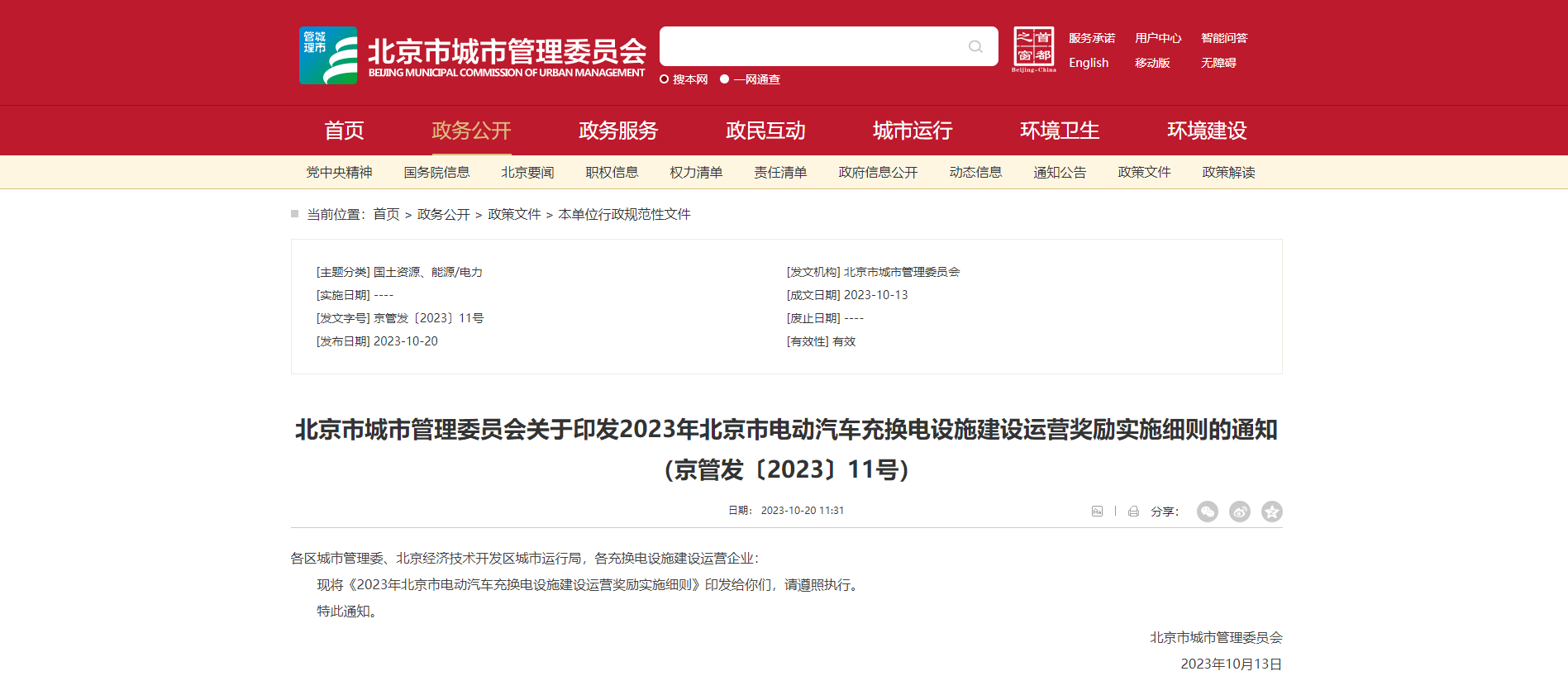 北京市城市管理委员会关于印发《2023年北京市电动汽车充换电设施建设运营奖励实施细则》的通知。