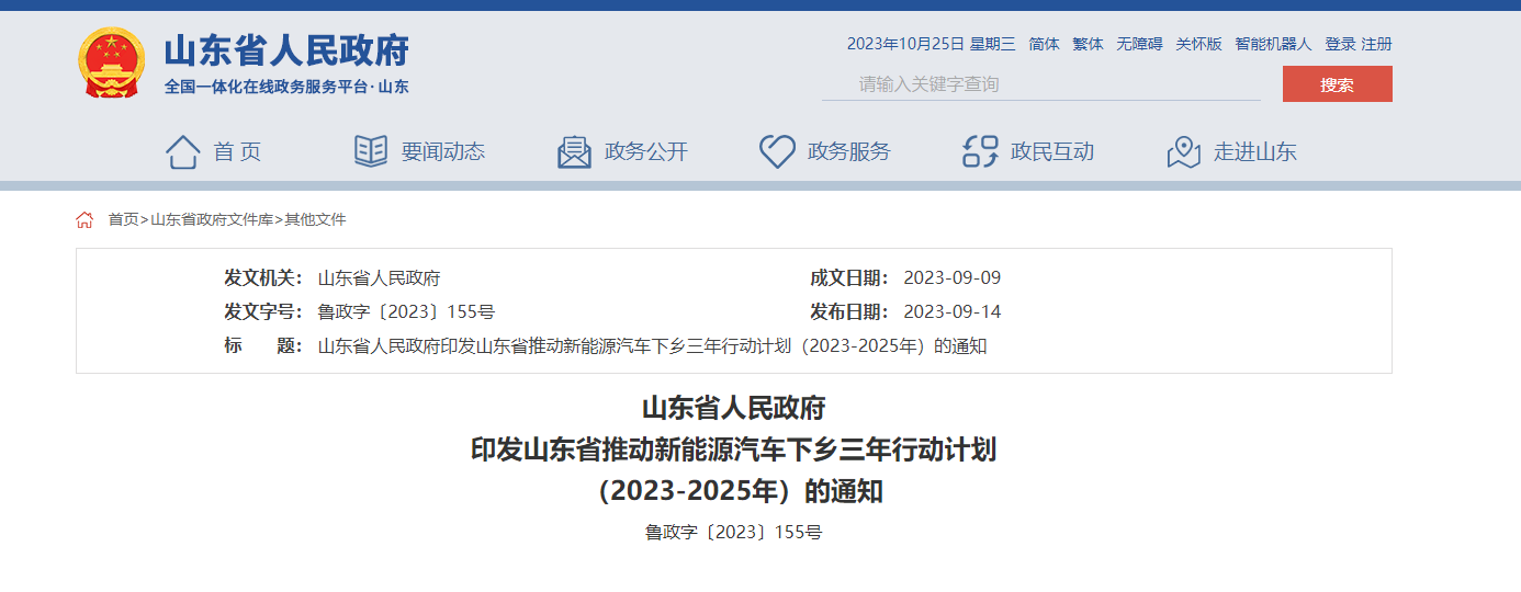 山东省人民政府印发《山东省推动新能源汽车下乡三年行动计划(2023-2025年)》的通知。