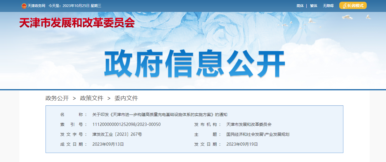 天津市发展改革委关于印发《天津市进一步构建高质量充电基础设施体系的实施方案》的通知。