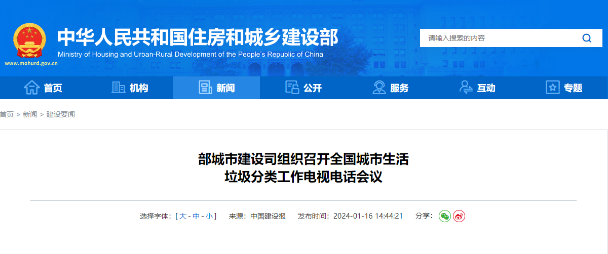 1月12日下午,住房城乡建设部城市建设司组织召开全国城市生活垃圾分类工作电视电话会议,认真贯彻落实习近平总书记重要批示精神,着力解决各地垃圾分类工作中的突出问题,进一步规范垃圾分类工作。